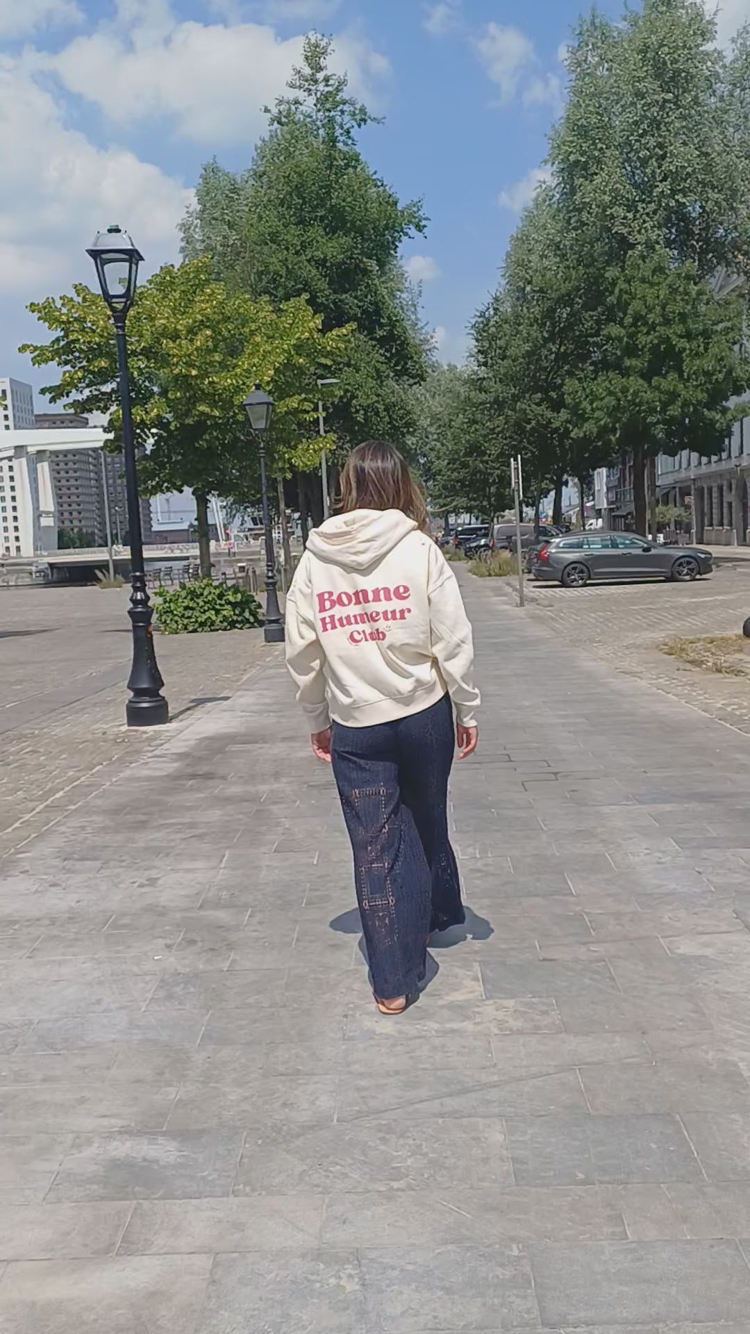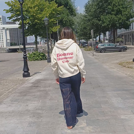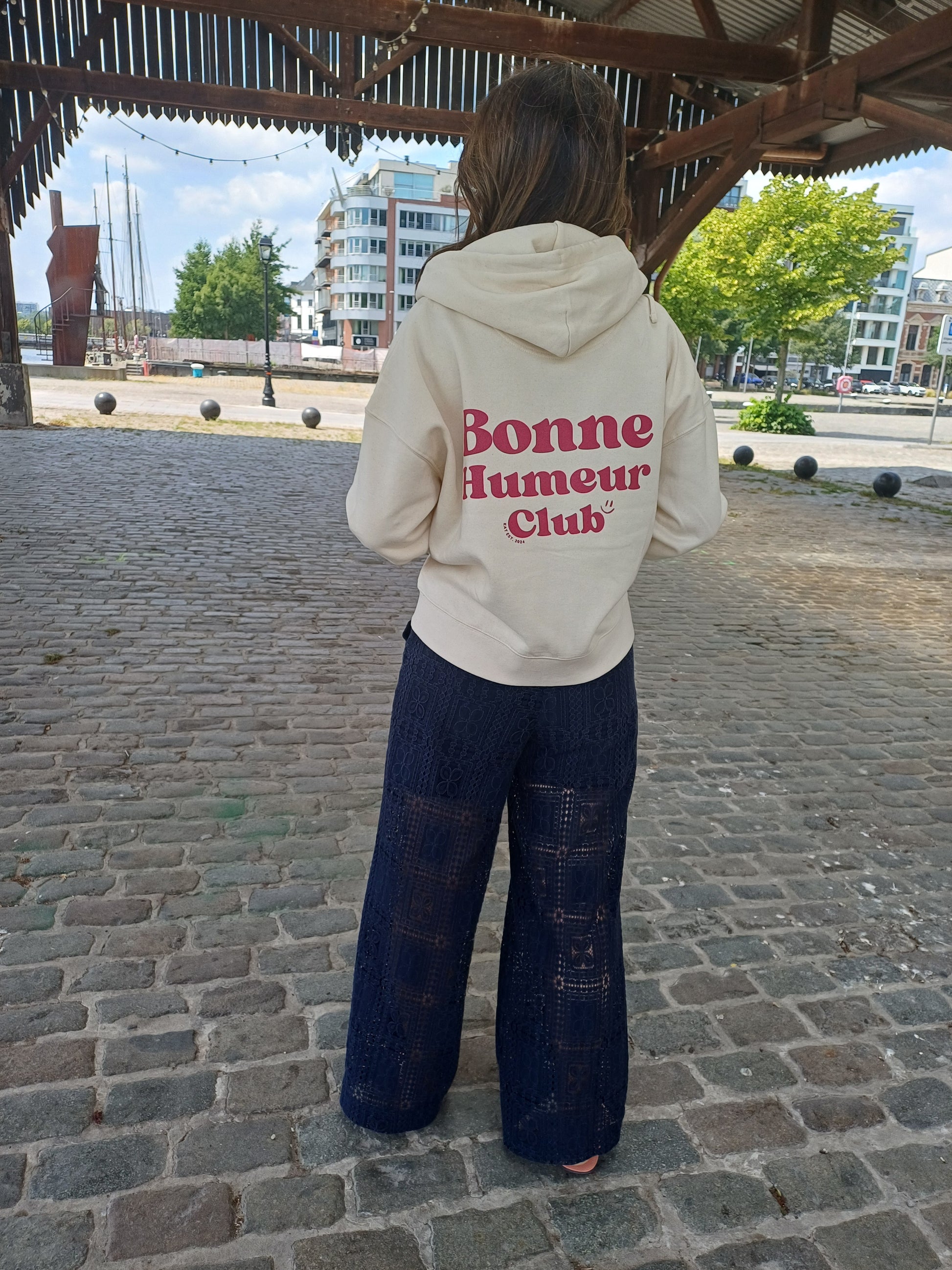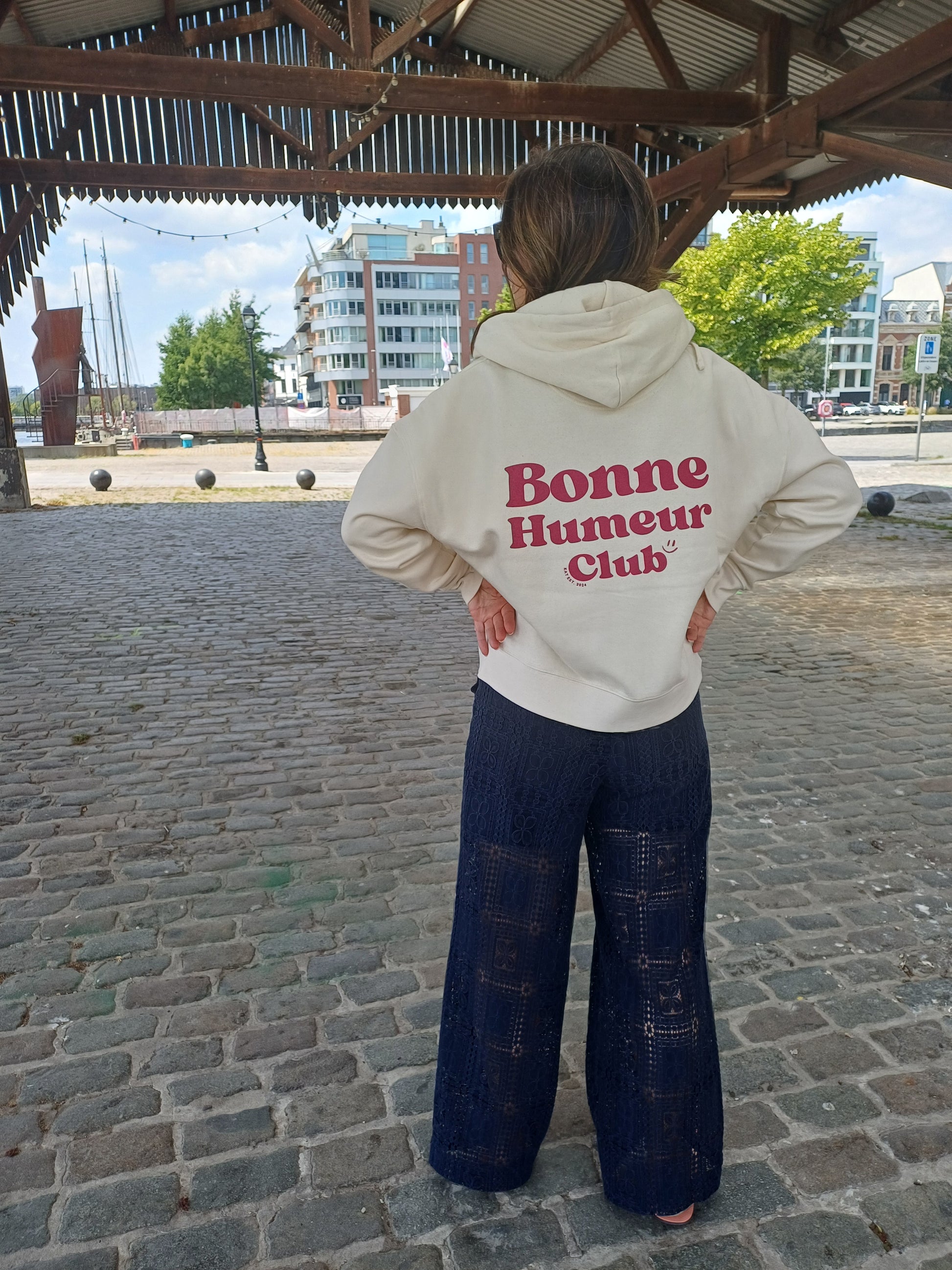 Featering a zipper, it's perfect for layering up or chilling out. inside super soft and made from 100% organic cotton - just the way we like it. The back is printed with 'BONNE HUMMEUR CLUB' for instant happy vibes.