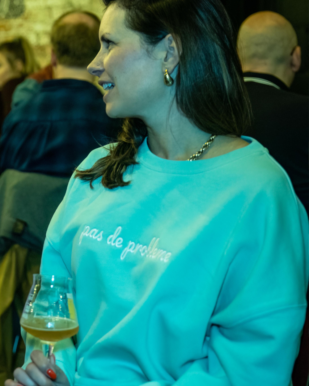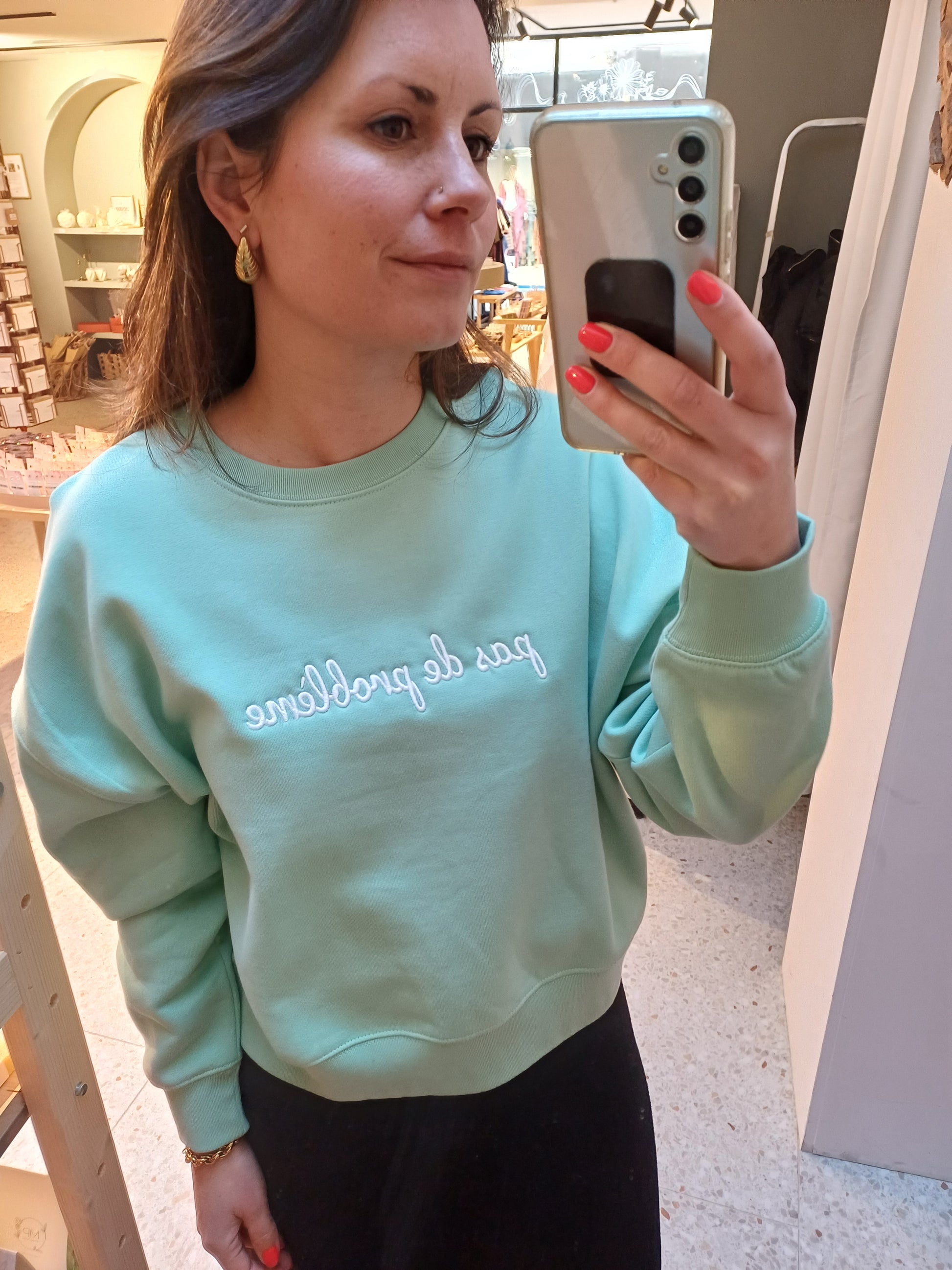 Fresh green sweater with our iconic 'pas de problème' quote.