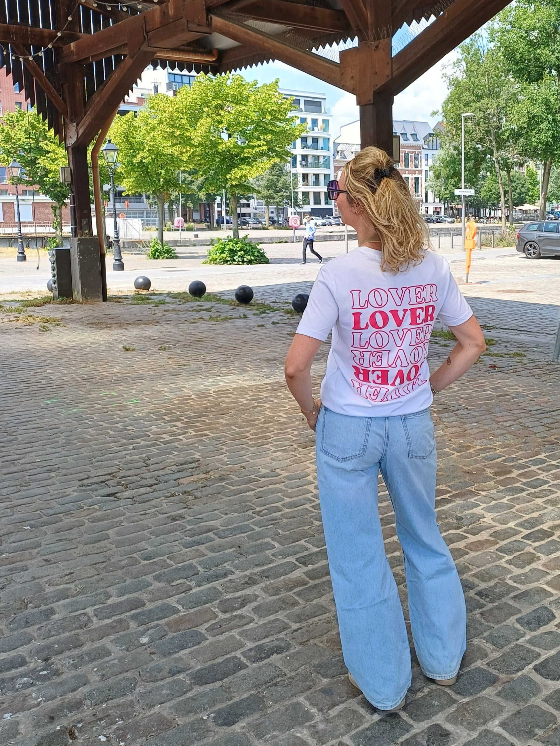 This playful T-shirt features "lover" printed on the back, made only for true lovers. It perfectly fits our mission to spread love all around.